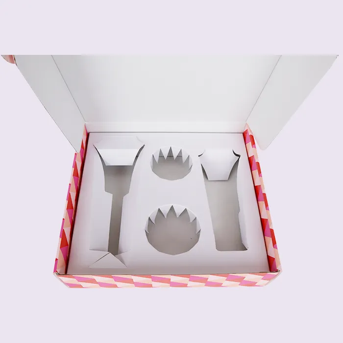 Kanggo sisipan kemasan, kita nimbang sawetara bahan: kertas, plastik, busa, lan sisipan cetakan sing ramah lingkungan. Pungkasane, kita milih sisipan kertas sing bisa didaur ulang amarga regane murah, wektu turnaround cepet, kesederhanaan, lan ramah lingkungan, alam biodegradable. Sisipan kertas kanggo Kothak Pengiriman Perawatan Pribadi ora mbutuhake cetakan khusus, mula ora ana biaya cetakan sing dibutuhake. Desainer kemasan Doyoupack pas karo dimensi, slot, tab, lan fitur interlocking adhedhasar sampel, banjur ngasilake sisipan liwat pemotongan mati. Sisipan kertas minangka bahan bergelombang siji-potong-biaya-efektif, biodegradable kanthi lengkap, lan ramah lingkungan banget. Ora mung nampilake produk kanthi apik nanging uga menehi dhukungan lan perlindungan. Sing paling penting, bisa nyuda bobot sakabèhé saka set produk dibandhingake sisipan eco-nyetak, sisipan plastik, utawa sisipan grayboard. Siji-potong sisipan corrugated lan siji-potongan Personal Care Shipping Boxes uga nggampangake transportasi warata.