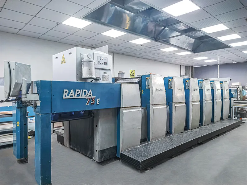 Kita nggunakake mesin cetak Heidelberg lan KBA-RAPIDA sing diimpor saka Jerman, dilengkapi colorimeters X-Rite lan kertu warna Pantone resmi, sing bisa ngukur lan mbandhingake warna kanthi akurat.